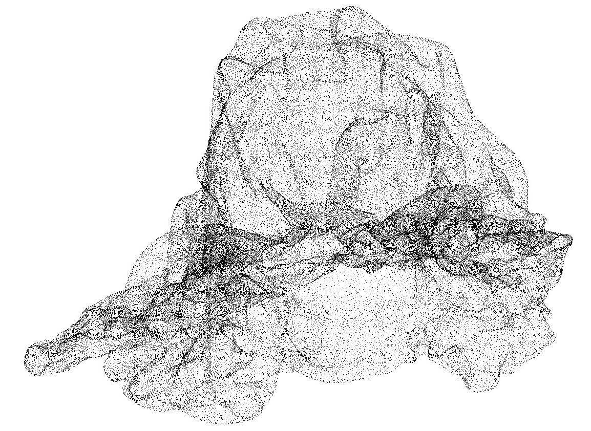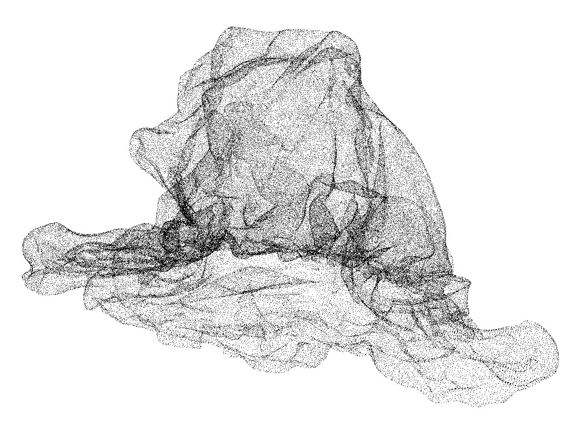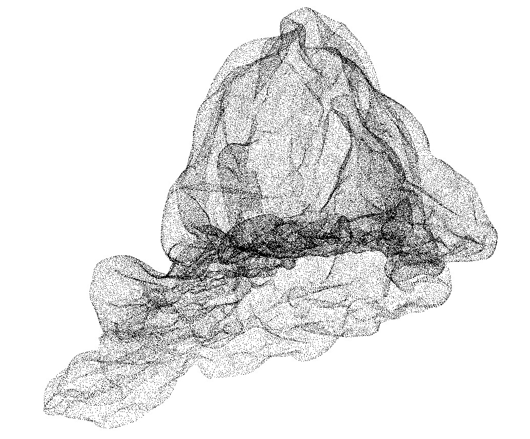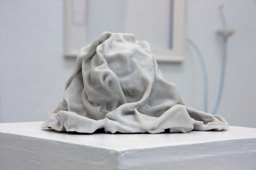 La matrice a été préalablement modelée dans un tissu rigidifié, numérisé puis imprimé. L’impression 3D peut-elle retranscrire les ondulations de ces plis et faire sentir le froissé du geste? Cette enveloppe tactile, réceptacle sensoriel fait entendre le son de sa propre gestation. La sculpture intérieure attendue restera inconnue visuellement du spectateur qui ne pourra en avoir qu’une perception sonore, une gestation rejouée à l’infini en une musique hypnotique. Bien au-delà du rapport froid qu’on peut entretenir avec les techniques de procédés additifs, quelque chose prend forme et vie.