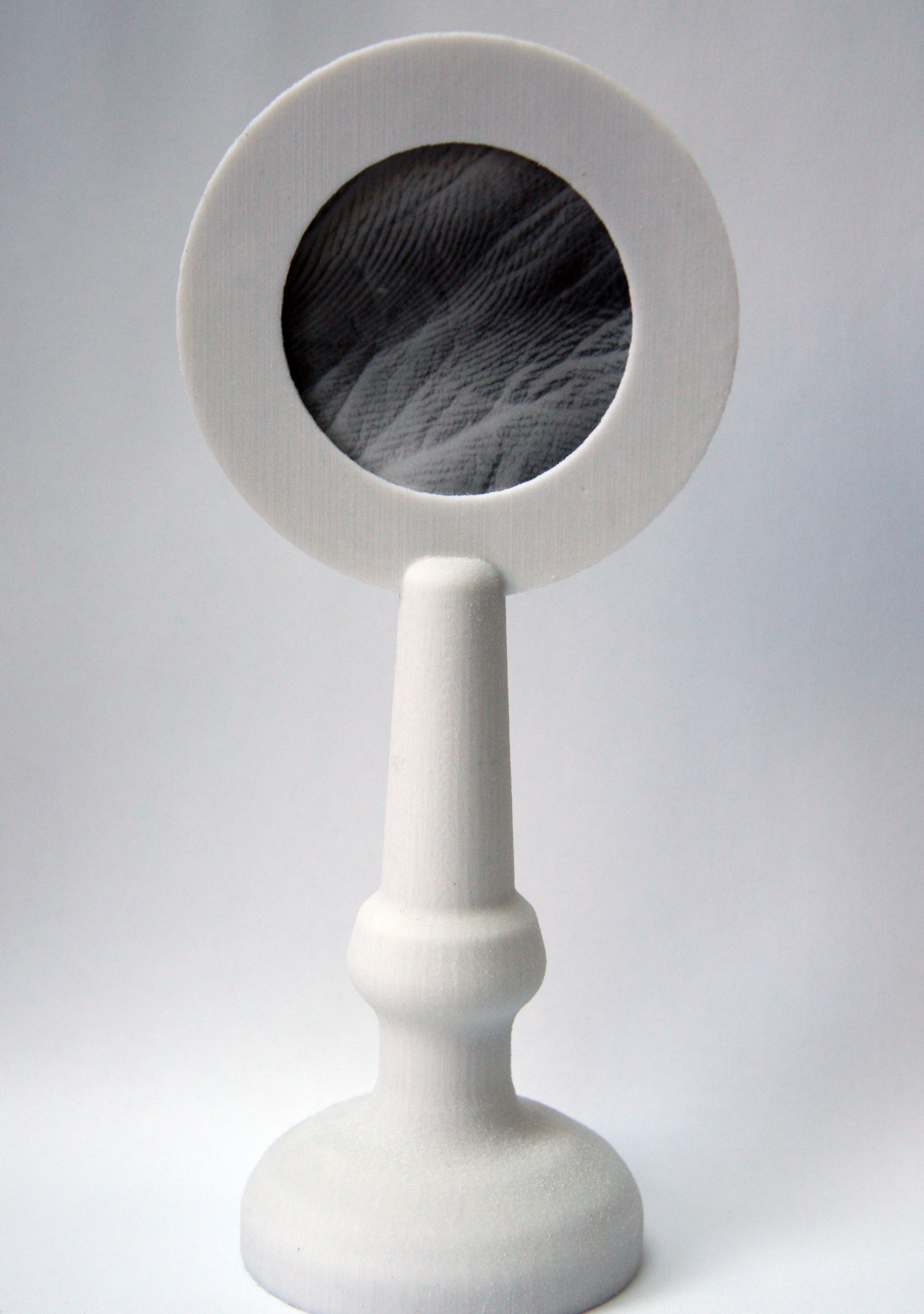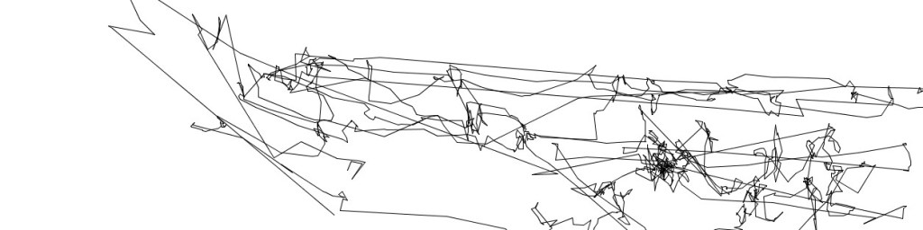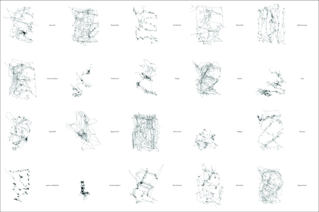 Un voyage, un lieu, qui reste emblématique. Quelque chose s’est passé. Quelque chose à garder en mémoire, à faire revivre. La photographie est un premier prolongement de la mémoire sensorielle. Mais comment prolonger l’expérience vécue, passée ? A l’aide d’un capteur, j’enregistre le mouvement de mes yeux face à cette photographie. Des heures passées à regarder de nouveau ce paysage. De ces protocoles de vision, j’accumule des tracés qui, une fois matérialisés, deviennent des reliques de regards. Je les conserve comme un souvenir pour rappeler l’importance des sensations visuelles.